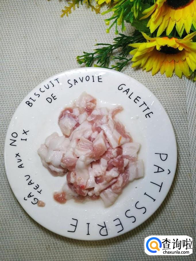 准备适量五花肉,洗净后切成块,放入盘中备用,五花肉肥瘦相间,非常适合做炸酱面。
