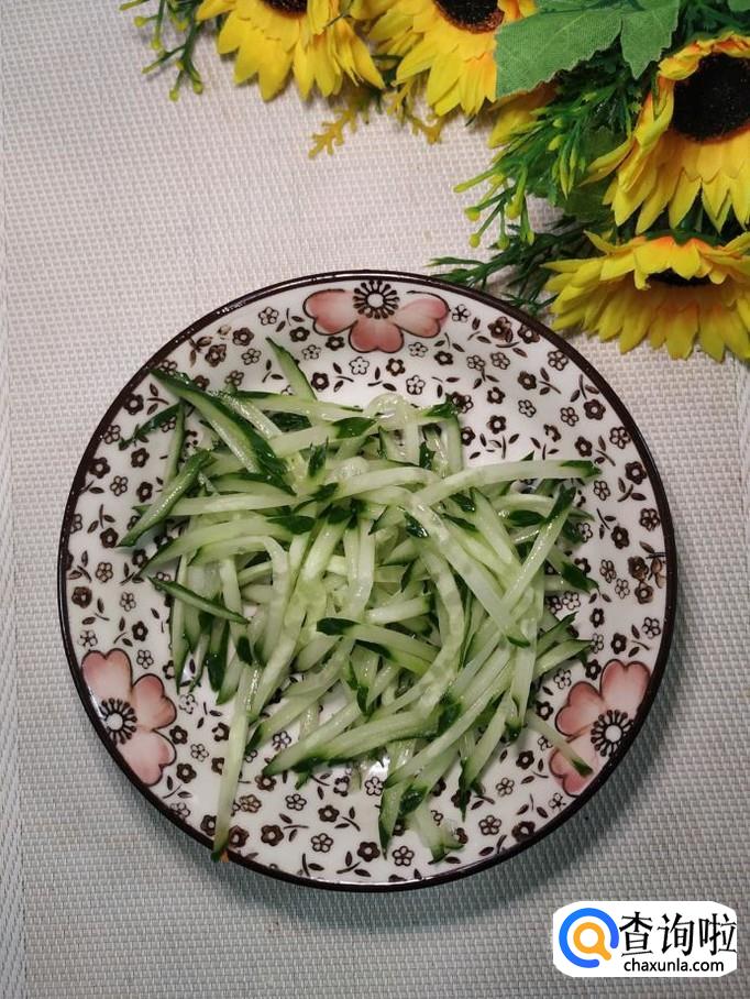 炸好酱之后,备用,碗中放入适量盐,鸡精,五香粉,生抽,陈醋,香油,再准备适量黄瓜,洗净后,擦成丝。