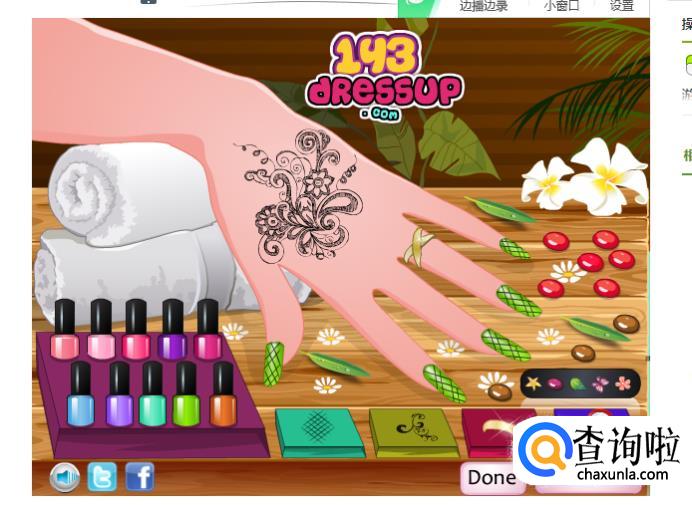 右下角的几个图案按钮,可以改变指甲上的花纹,给手上画一个纹身,戴上戒指,改变肤色。