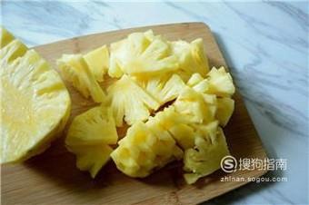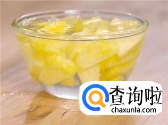 然后把切好的菠萝肉用盐水浸泡,这样能抵制菠萝酶的活力,否则的话吃了会容易生口疮。