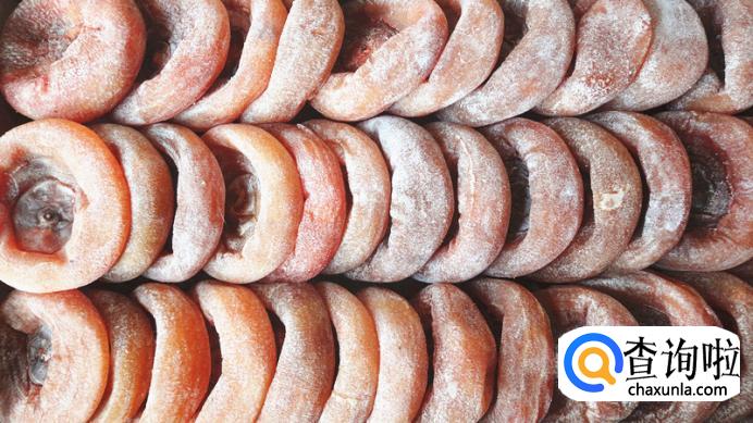 柿霜是果肉内可溶性固形物渗出的结晶,主要成份是葡萄糖和甘露醇,其味清凉甘甜,有润肺,化痰,止咳之功效。柿霜披覆于柿饼表面,不但美观,而且能预防霉菌的感染和减少水分蒸发, 保持柿饼柔软可口。上霜时,先将缸洗净,然后给缸底铺一层10厘米厚的干柿皮,柿皮上立放一层柿 饼,柿饼上再放一层柿皮,再立放一层柿饼,直至装到八成满,上面盖上柿皮,加盖,用泥封缸,置于阴凉处约经1个月左右即可上霜。 柿饼能否上霜,主要取决于柿饼本身的含水量,晒得过干或过湿,都不易出霜。因此,在入缸时应检查其所晒程度。若用手压有坚硬感,表明晒得过干,应在柿皮上喷洒少量水,用塑料薄膜覆盖 1-2小时,使柿皮将水分吸收后再入缸。若用手压无弹性,感觉过软,表明晒得不够干,应选择干燥通风处再晾晒1-2天,否则入缸后会造成柿饼表面出水,发粘,霜少,或根本无霜。此外,上霜与环境温度也有关系,温度越低,上霜越好,因为低温使可溶性固形物溶解度下降,容易结晶析出。