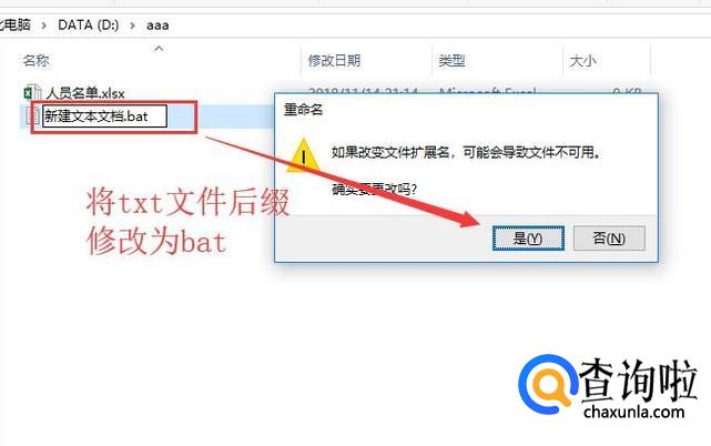 然后我们需要修改txt文件的后缀名,将其修改为bat,修改的过程中会弹出如下图的提示,我们点击是即可