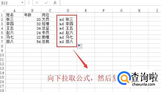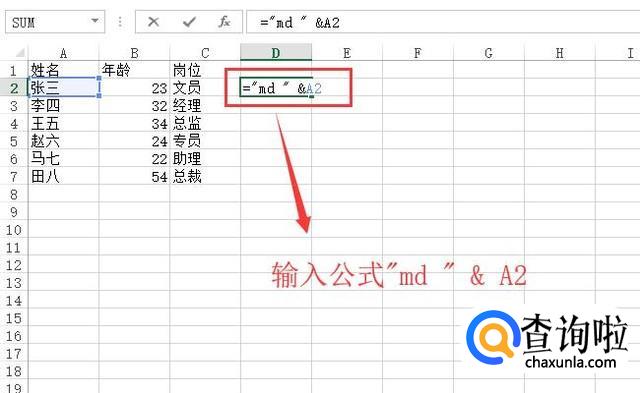 接下来我们采用一种巧妙的办法,首先在excel表格的空白列输入公式"md "&A2,如下图所示