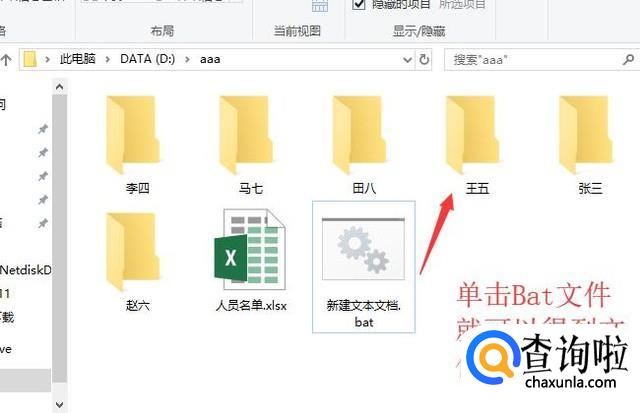 接下来我们单击bat文件就可以在当前文件夹下面看到依据excel中人员姓名建立的文件夹了,如下图所示
