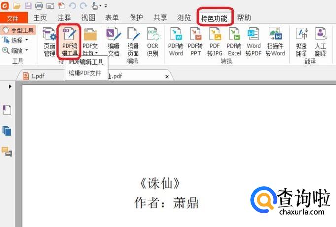 点击“特色功能”,然后如图所示,点击“PDF编辑工具”。