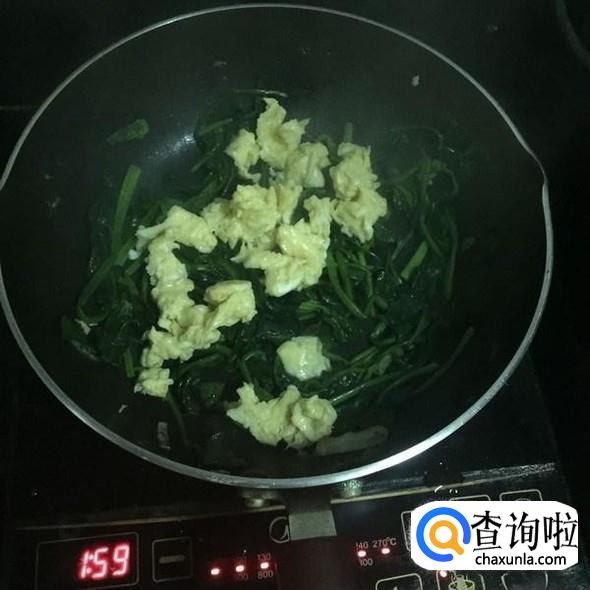 接着把鸡蛋倒入锅中和波菜一起翻炒一分钟。