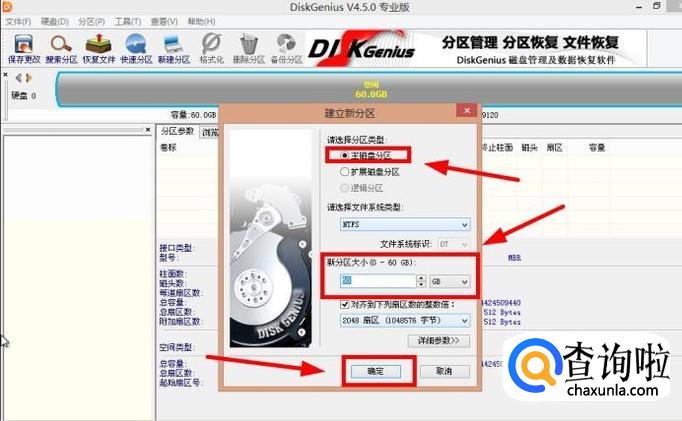 在“分区类型”选择“主磁盘分区”,自定义好分区大小,其他保持默认,完成设置后点击“确定”