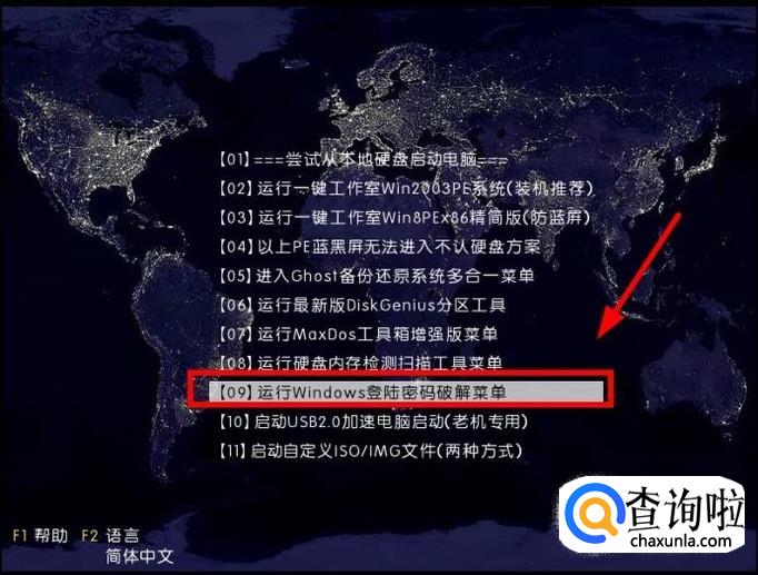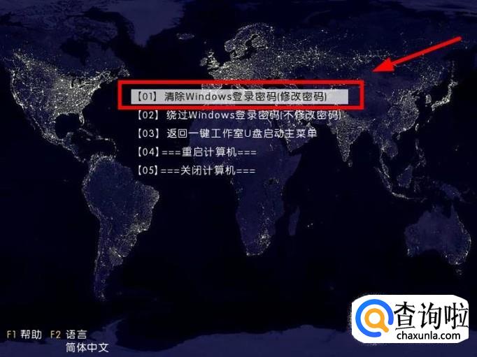 设置好U盘启动,进入U盘系统中,点击“运行Windows登录密码破解菜单——清除Windows登录密码(修改密码)”选项