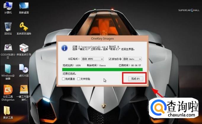 设置好参数后,点击“确定”开始还原,等待还原完成,完成后点击“完成”