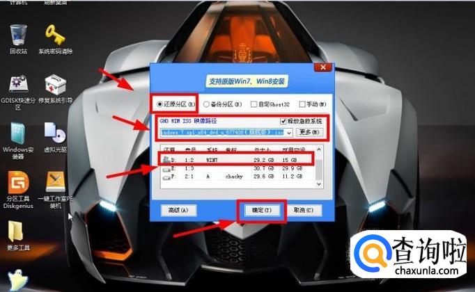 选择“还原分区”找到镜像路径文件,设置好需要还原的分区,设置好后点击“确定”