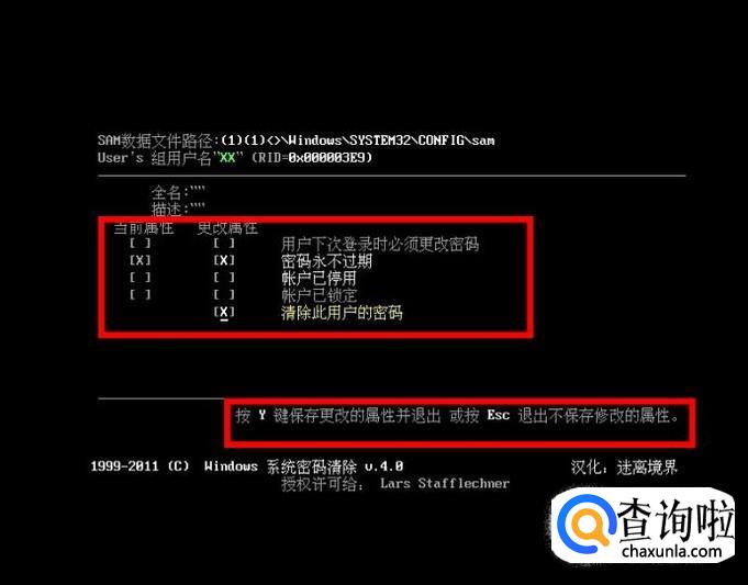 选择“清除此用户的密码”,按“Y”键保存设置后,重启电脑,就可以清除账户登录密码了