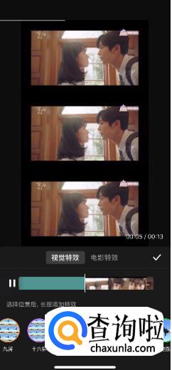 然后看到下面有很多特效,第一个三屏是横着的三屏,往后划有竖着的三屏,选择完了以后,点击勾完成。