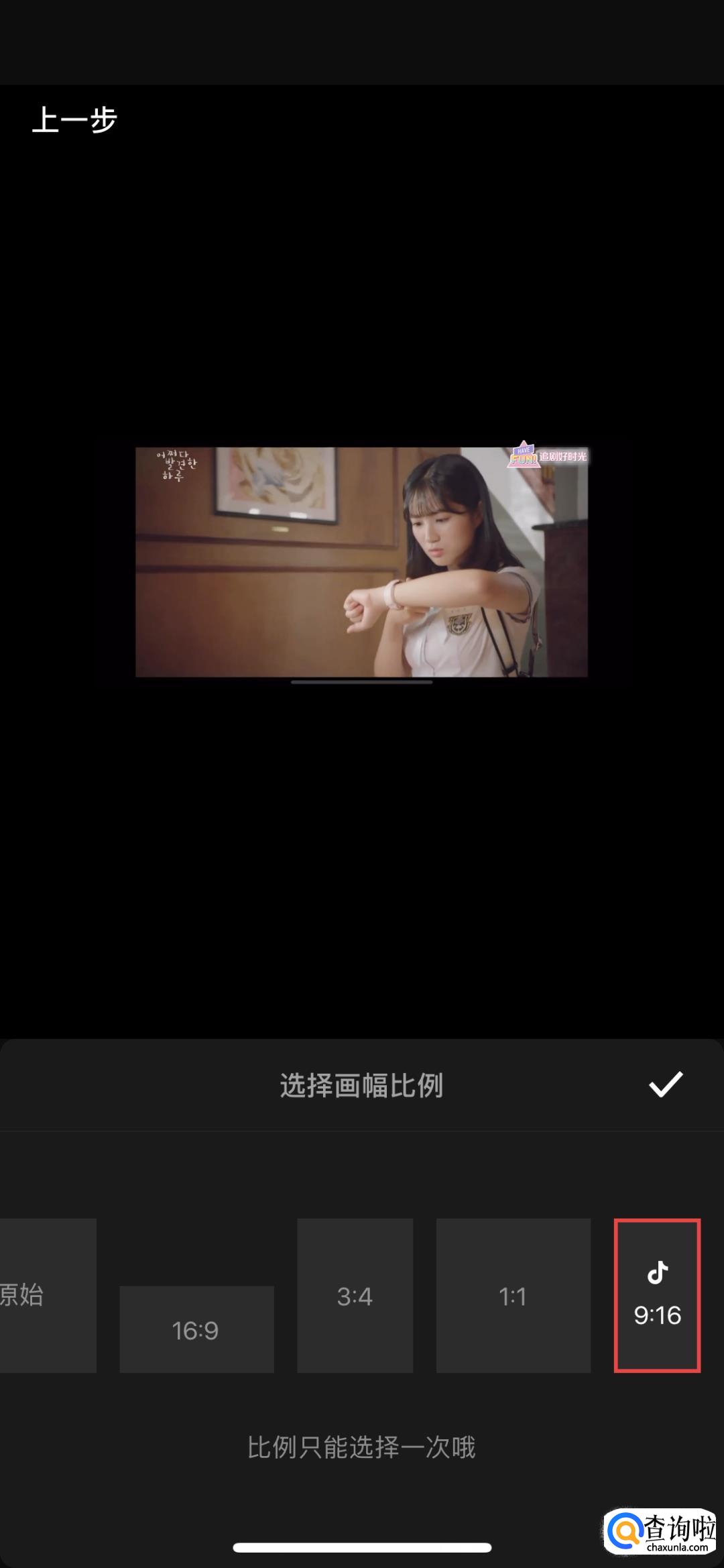 然后打开咱们需要编辑的视频,选择下面的9:16,再点一个勾完成。