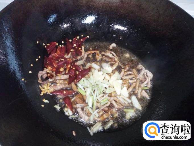 炒至肉丝颜色微白,放入料酒,一匙儿耗油,放入葱,姜,蒜,红干椒翻炒。