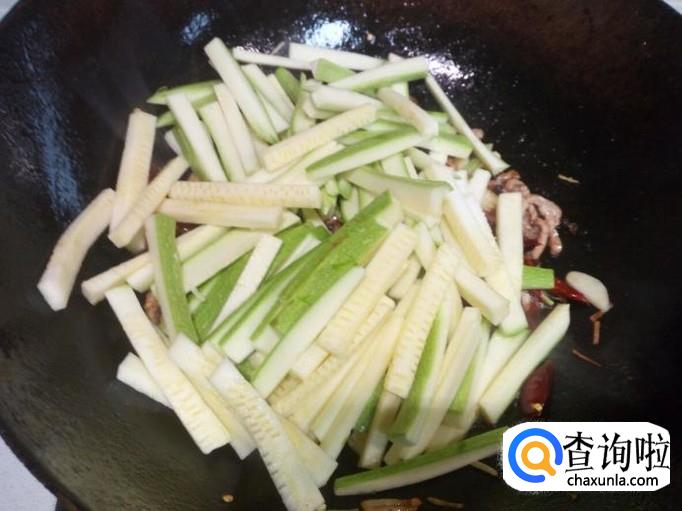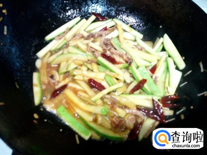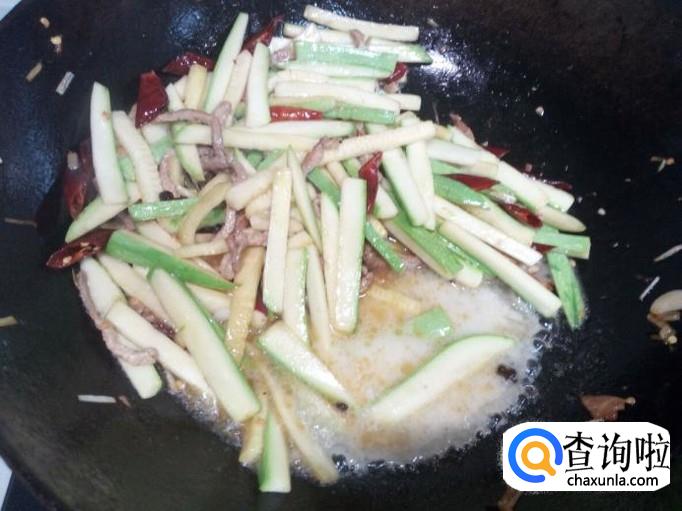 放入角瓜翻炒,放入盐。角瓜翻炒至断生,放入勾兑好的芡汁。
