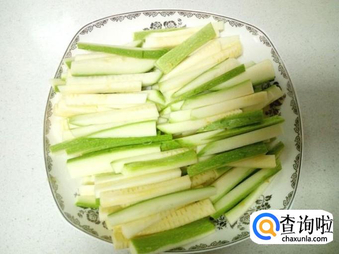 角瓜用水清洗干净,控干水分,切成条。角瓜比较嫩,所以我没有去除瓜瓤。