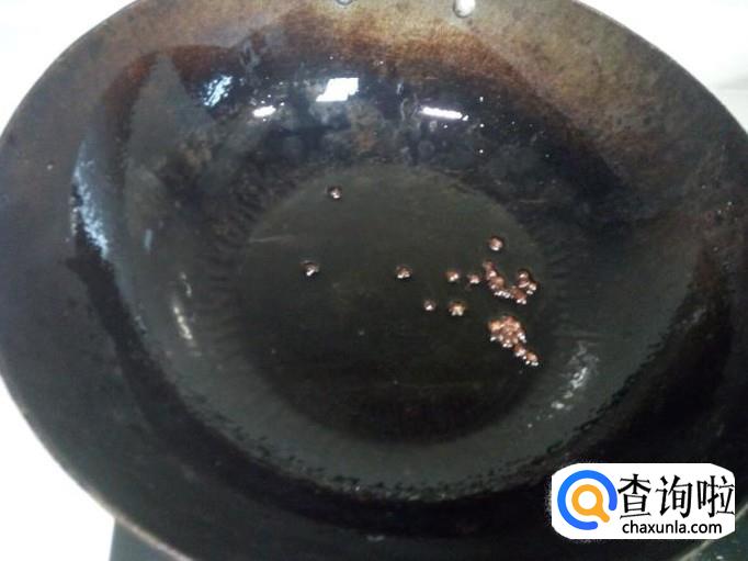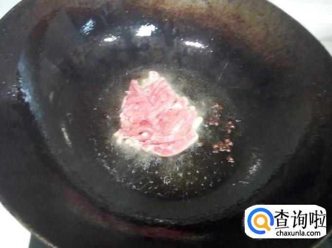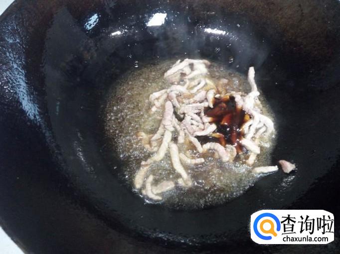 锅内放入油加热,油热后放入花椒爆香。放入肉丝翻炒。