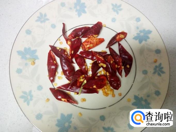 红干椒用水清洗干净,控干水分,斜刀切成段。