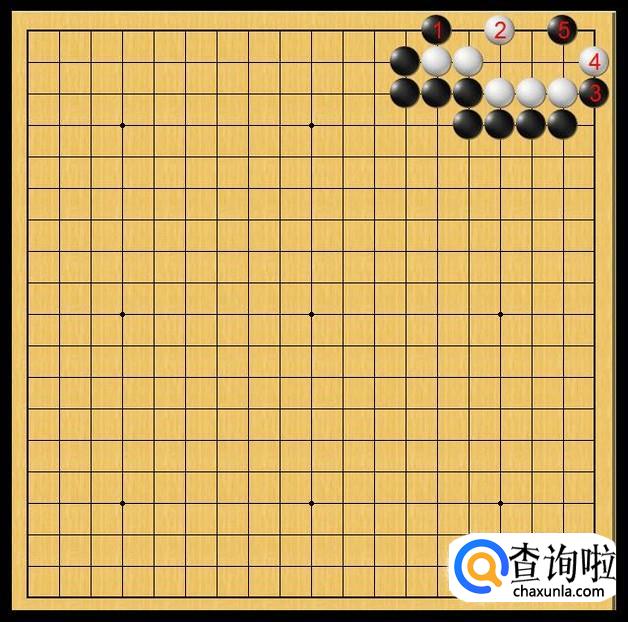黑棋根本不管黑3的死活,黑棋恰恰是通过黑3来取得白4的应手,以便抢占白棋做活的最重要的眼位。这不,黑棋在黑5处落子,黑5的位置正好是白棋右上角的左面,和白4互为犄角。如图所示。
