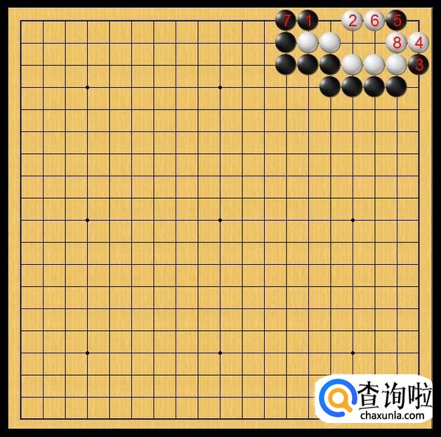 白棋急忙在白8处粘上,白8粘上后叫吃白棋右上角的左面的黑子。这时候,白棋在理论上已经有了两个眼,白棋存活理论上无忧。如图所示。