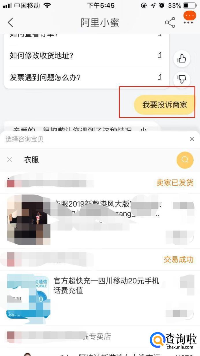 马上会弹出一个对话窗口,将自己的投诉内容发送给客服。就会弹出一个订单框,输入货品名称。