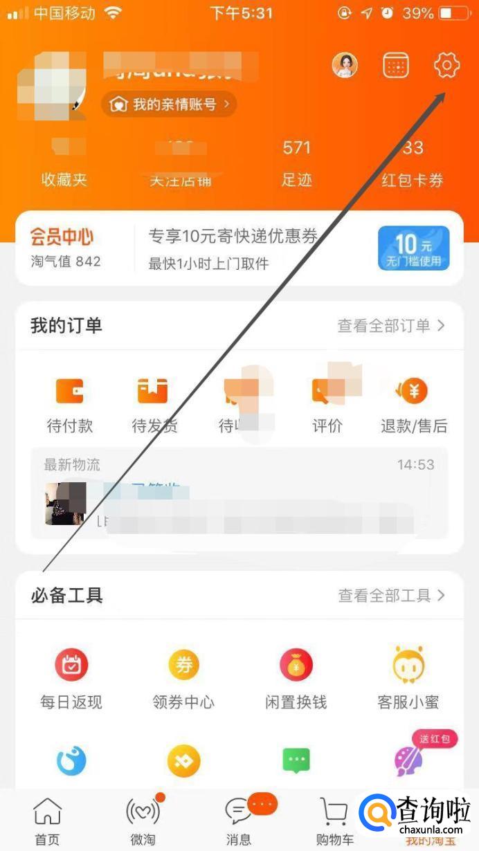 首先下载手机淘宝,用手机号码注册一个淘宝账号,然后登录。点击最底部(我的淘宝),接着点击右上角的设置(螺丝帽)。