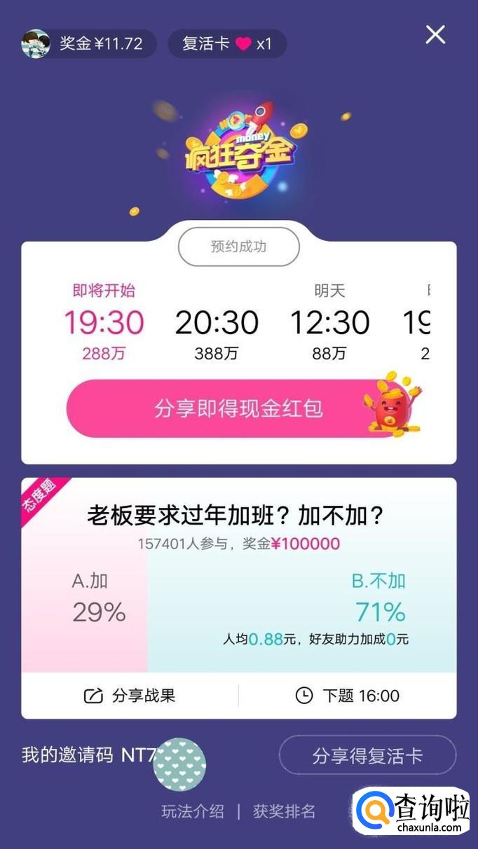 这是活动页,在这里可以查看当天所有的场次安排和奖金金额。分享活动给好友就可以获得一个红包(其实就是每天给一次0.18元的红包,亲测)。邀请码可以通过分享给好友获取,也可以自己填写获取一个。在官方出题区出题也可以获取复活卡。