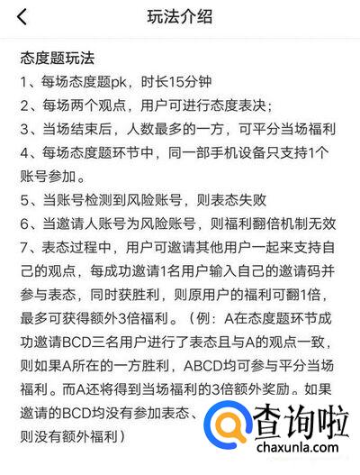 态度题每天12:00开始到晚上9:00.每个整点有一次,题目没有正确答案,自己可以选择一个你认为正确的答案,多数者获胜平分奖金。宝箱题每题答对获得一次宝箱,里面有不定量的现金和复活卡!