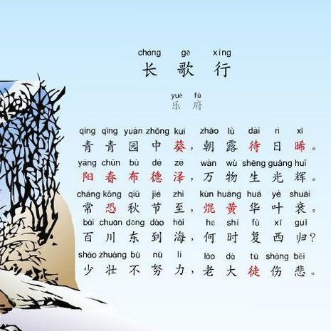 “少壮不努力,老大徒伤悲”,出自《长歌行》这首诗。年少时如果不珍惜时间努力向上,到老只能白白地悔恨自己与悲伤了。提醒我们应该珍惜时间,不应浪费时间,也用来告诫我们,要趁年纪还轻,好好努力,不要到老了的时候,一事无成,这样只能留下悲伤、悔恨。《长歌行》是一首中国古典诗歌,属于汉乐府诗,是劝诫世人惜时奋进的名篇。此诗从整体构思看,主要意思是说时节变换得很快,光阴一去不返,因而劝人要珍惜青年时代,发奋努力,使自己有所作为。全诗以景寄情,由情入理,将“少壮不努力,老大徒伤悲”的人生哲理,寄寓于朝露易干、秋来叶落、百川东去等鲜明形象中,借助朝露易晞、花叶秋落、流水东去不归来,发出了时光易逝、生命短暂的浩叹,鼓励人们紧紧抓住随时间飞逝的生命,奋发努力趁少壮年华有所作为。其情感基调是积极向上的。其主旨体现在结尾两句,但诗人的思想又不是简单的表述出来,而是从现实世界中撷取出富有美感的具体形象,寓教于审美之中。