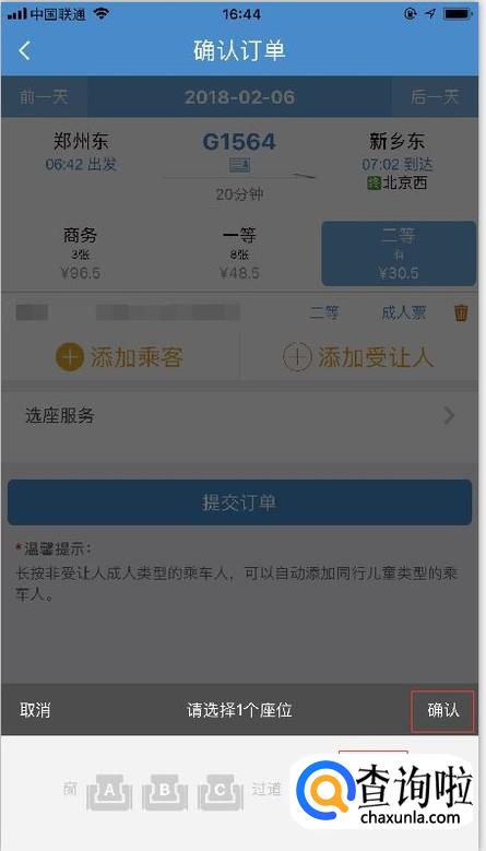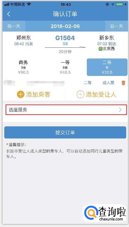 选择你想要乘坐的车次,点击进入,选择好乘车人。我们在当前页面可以看到选座服务选项,如图所示。