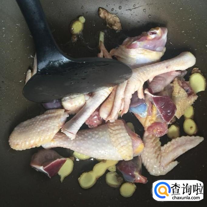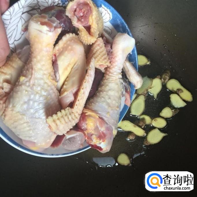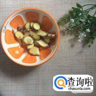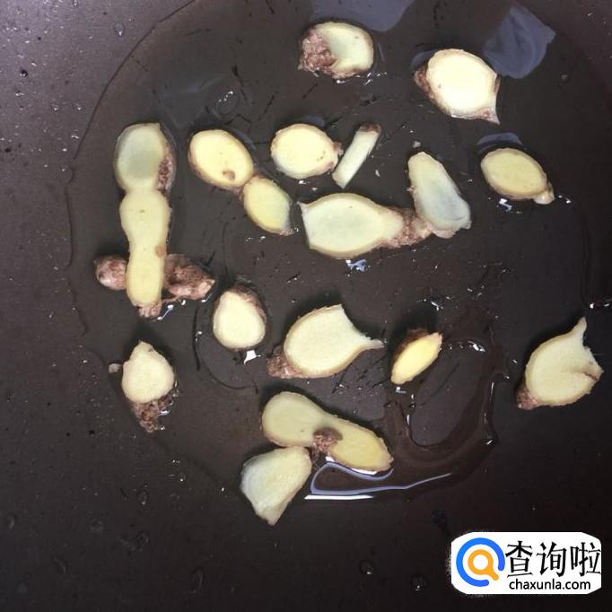然后把生姜切成片,倒入锅中爆香。