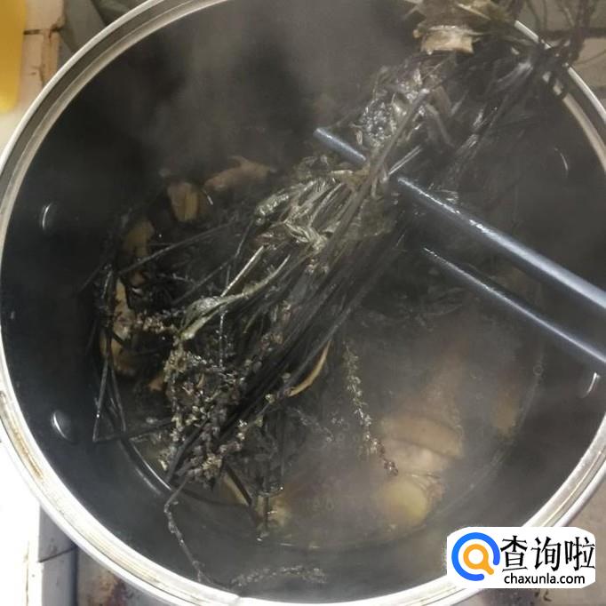 把汤中的车前草捞出丢掉,有条件的可以把鸡汤过滤一下,因为车前草上有很多小颗粒,这些颗粒是会影响口感的。