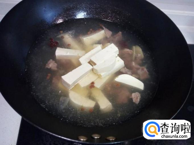 大概炖至50分钟(用筷子插一下,可以插透),牛肉炖烂糊后,把切好的豆腐,放入锅中,放入盐,转大火烧开,再转中火炖五分钟的时间。