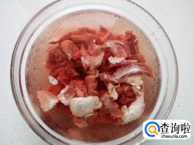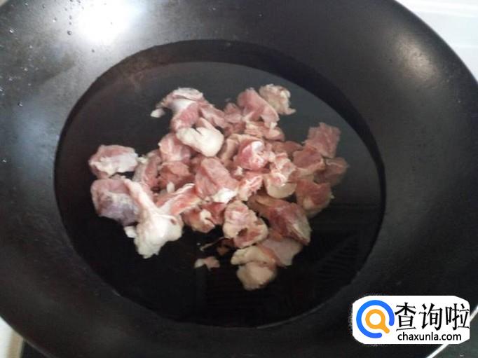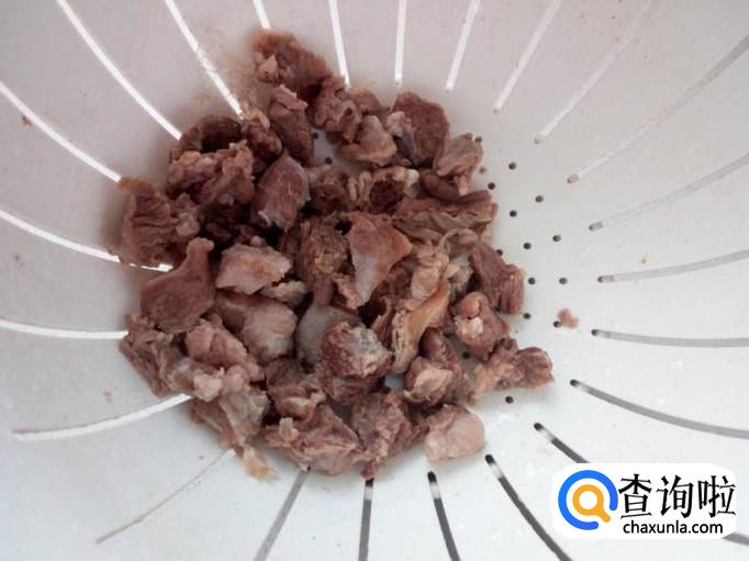 把切好的牛肉放入冷水锅中烧开,水开后煮一分钟的时间,把牛肉捞出,用水冲洗干净(血水和沫子),控干水分。