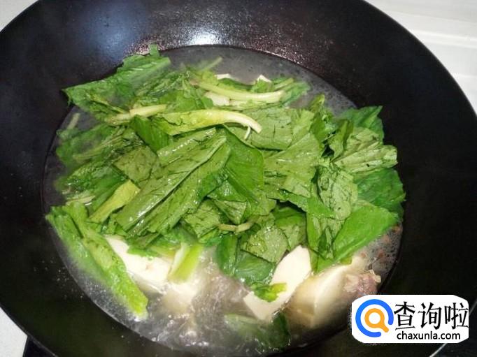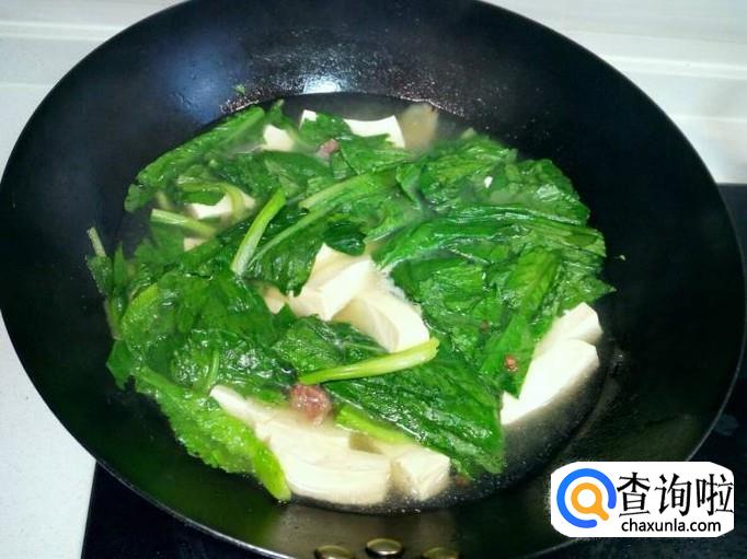 然后放入小白菜,小白菜用勺略翻几下即可。放入味精,关火出勺。