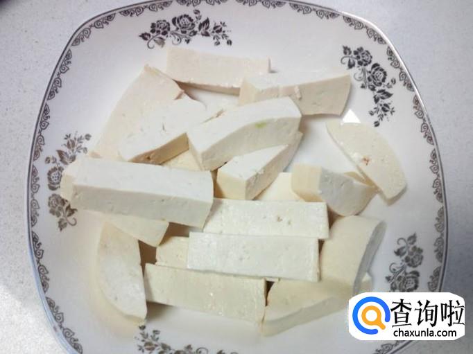豆腐用水冲洗干净,控干水分,切成条。