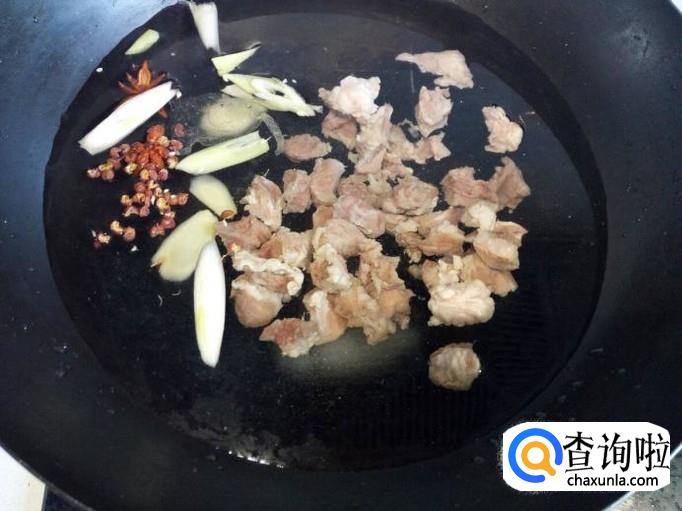 锅内重新放入水,放入牛肉,放入花椒,八角,葱姜,料酒,少许白糖(先不要放盐),大火烧开,转小火慢炖。