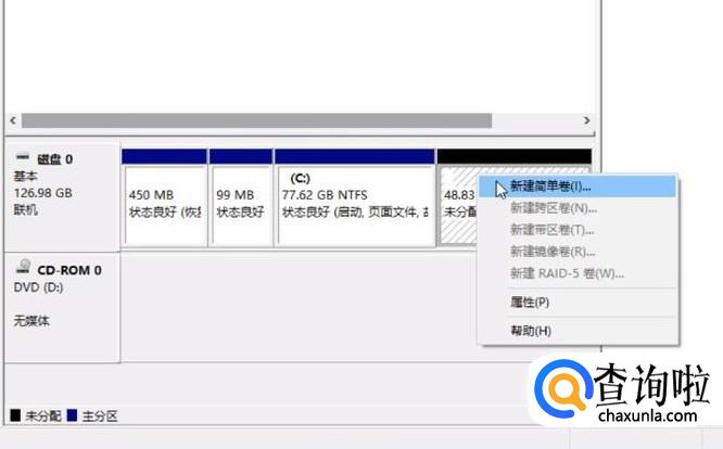右键单击“未分配”空间,然后从结果菜单中选择“新建简单卷”。