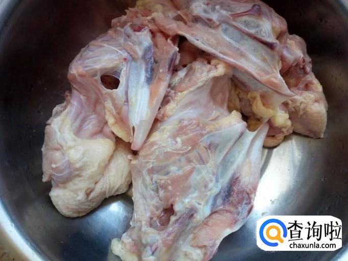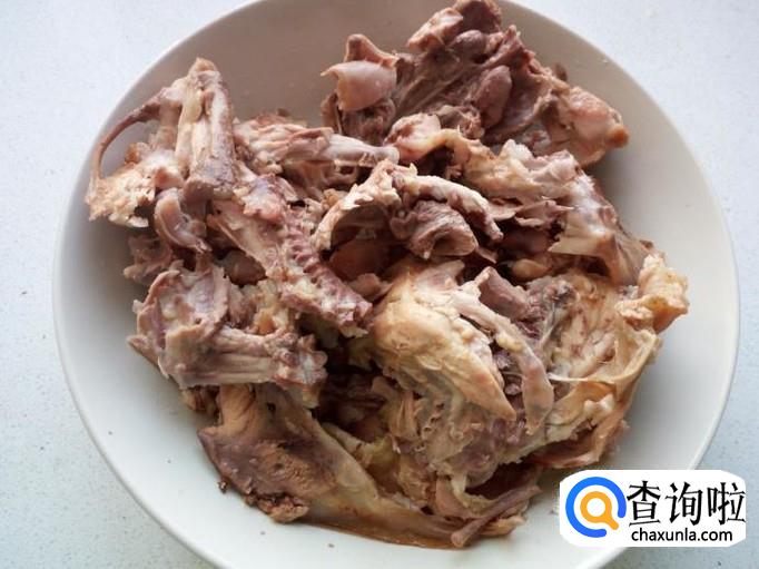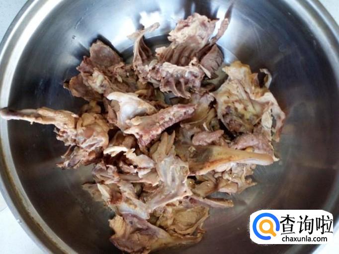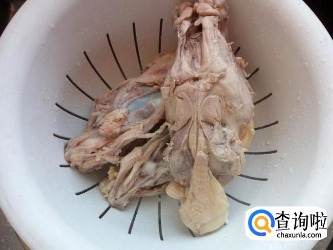 煮好的鸡架晾凉后(不烫手),用手把鸡架掰成块,去掉鸡尾不要。