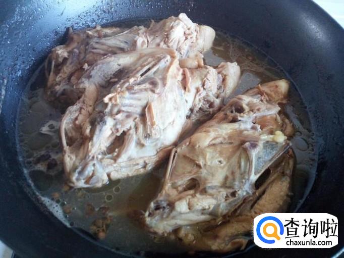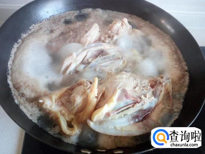 锅内重新放入水,放入鸡架,放入花椒,八角,盐,酱油,少许白糖,料酒,大火烧开,转小火慢煮。大约煮20~30分钟的时间(用筷子插一下鸡架,能插透即可),鸡架煮熟后,关火。