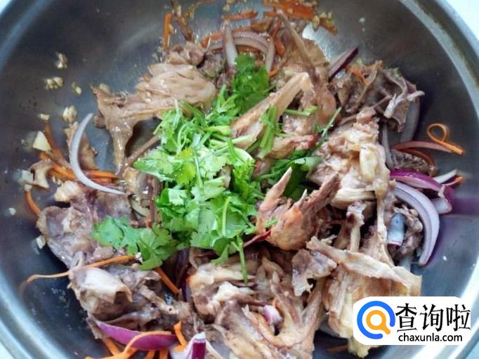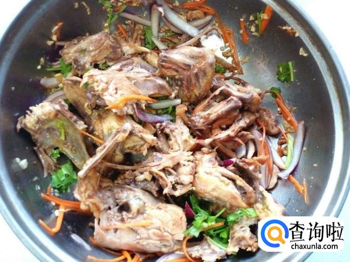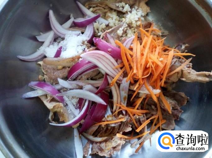 把掰好的鸡架放入盆中,放入圆葱丝,胡萝卜丝,蒜末。放入少许盐,味精,一匙儿白糖,一匙儿陈醋,一匙酱油,拌和均匀。