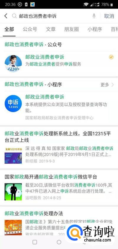 如果在线客服也不能解决我们的问题,那么我们还可以向邮政投诉。首先打开微信,搜索“邮政业消费者申诉”。