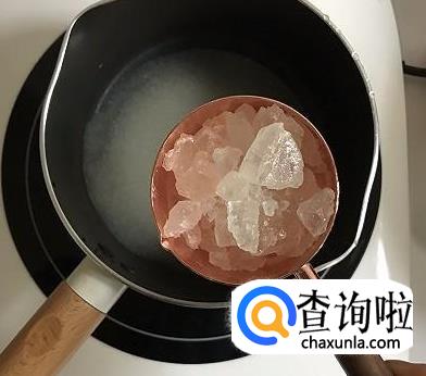 然后,准备一口锅,往锅中倒入一碗水,放入白糖100克和冰糖50克,开火熬煮。