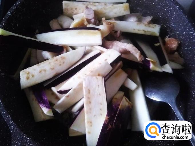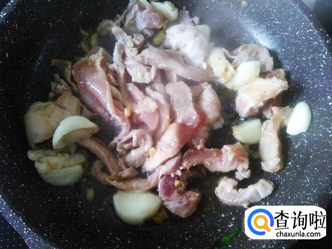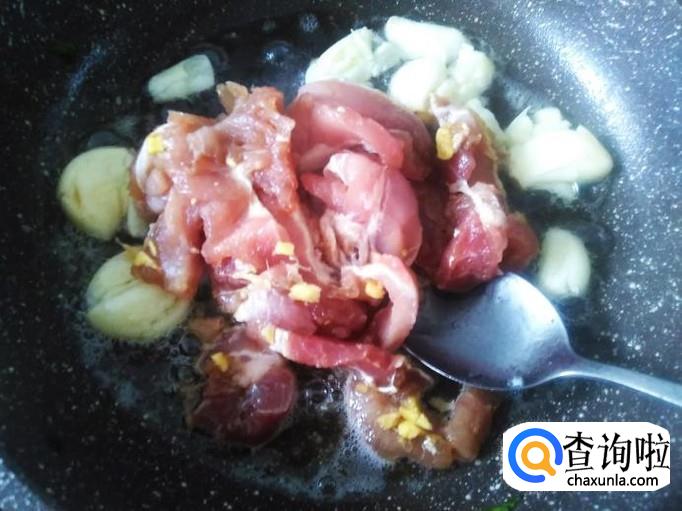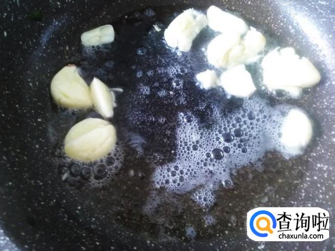 开火下油,放蒜米进去爆香,然后放猪肉进去。