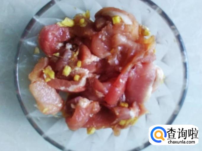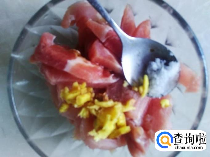猪肉切成片,加适量的盐、姜蓉、1勺生抽、1勺料酒腌制几分钟。