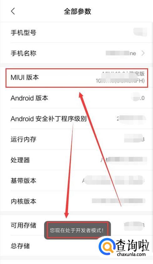 通过多次连点手机“全部参数”中的“MIUI版本”,让手机进入开发者模式。