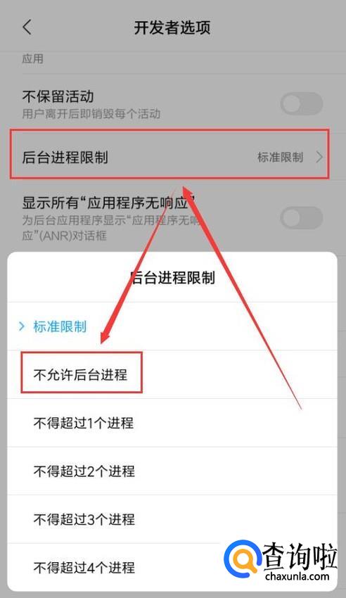 然后进入“开发者选项”,找到“后台进程限制”,在弹出列表中选中“不允许后台进程”,这样就可以限制各应用的后台运行。