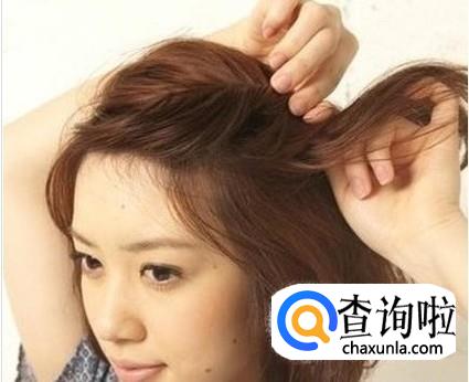 将头发中分,取头顶二分之一的发量,采用螺旋的手法旋转至太阳穴的水平线上,别上美丽的发卡,元气少女就是你啦~