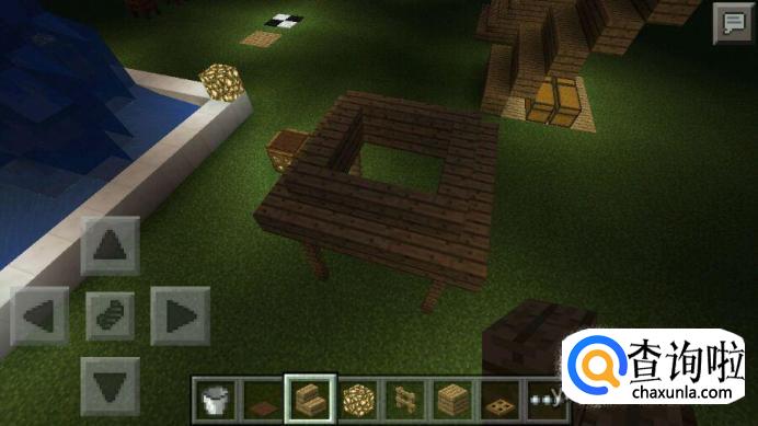 首先,在凉亭边上,搭建出泳池的大概形状,具体颜色可自行搭配,首先先挖一个九乘以十八的坑。