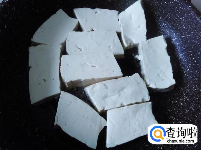 开火下油,把豆腐摆到锅里用小火煎,煎至两面金黄色铲上碟子。